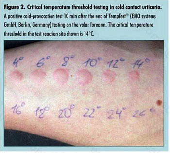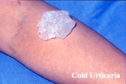 Triệu chứng ngứa, phát mày đay trên diện tích da tiếp xúc với lạnh, thường kéo dài khoảng nửa giờ hoặc kéo dài hơn, nữ hay gặp hơn nam giới. Sưng tay khi đang cầm nắm các vật lạnh, sưng môi khi ăn thức ăn lạnh, sưng lưỡi và họng, có thể gây khó thở do phù nề hầu họng hay đường hô hấp. Bệnh nhân có thể bị bất tỉnh, nhịp tim nhanh, sưng chân tay hoặc thân mình, đau quặn bụng, nôn, tiêu chảy, phù não, khó thở cấp tính rất nguy hiểm đến tính mạng.