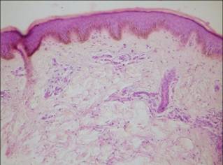 -Thoái hóa nhầy thể xơ cứng lan tỏa (bệnh phù niêm cứng): Tổn thương thường kết hợp giữa sẩn và cục. Các thương tổn có ranh giới rõ, về sau trở thành các đám thâm nhiễm lan tỏa. Tổn thương có thể là đám da lớn, thậm chí toàn thân với màu sắc của tổn thương gần như da bình thường, trắng nhợt, hơi vàng hay hồng đỏ. Dấu hiệu véo da âm tính. Trong trường hợp nặng, thân mình, cổ tay, cẳng tay như một cái ống không đàn hồi, các ngón tay sưng, cử động rất khó khăn. Tình trạng xơ cứng có thể rất nặng dẫn đến co kéo, làm ảnh hưởng đến các hốc tự nhiên (mồm, mũi, mắt), làm lộn mi mắt;