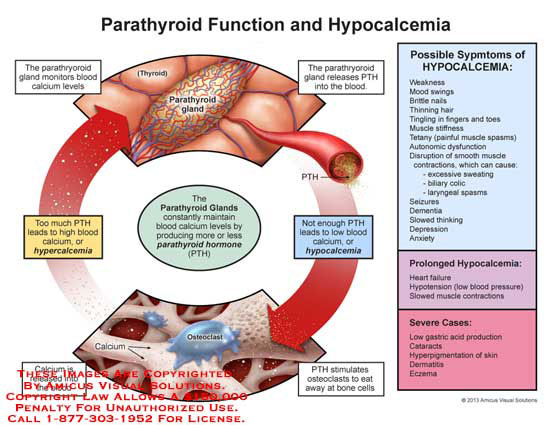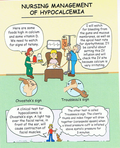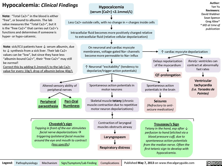 Nồng độ canxi máu thấp được cho là do suy tuyến cận giáp, tuyến này có vai trò điều hòa số lượng canxi trong cơ thể bạn, hoặc do nồng độ phốt phát máu cao, chất này có thể làm giảm nồng độ canxi máu. Hạ canxi máu cũng có thể do nồng độ albumin máu thấp, chất này được sản xuất tại gan, và nó rất quan trọng trong việc điều hòa dịch trong tế báo và mô của cơ thể bạn. Thiếu hụt magiê, vitamin D, hoặc khẩu phần canxi cũng rất quan trọng để duy trì nồng độ canxi máu thích hợp. Nguồn thức ăn có chứa canxi bao gồm các sản phẩm sữa (sữa và pho mát), cũng như rau dền, rau cải, bông cải xanh, và cam.