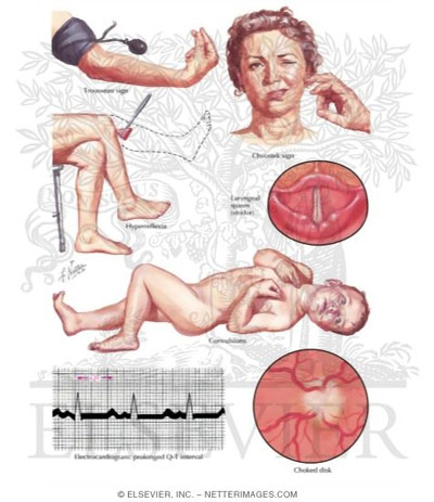 - Co thắt cơ (biểu hiện kín đáo có thể phát hiện bằng dấu hiệu Trousseau được gây ra bằng cách cuốn băng huyết áp ở cánh tay và bơm băng đo cao hơn huyết áp tâm thu 20 mmHg, giữ mức áp lực này trong 3 phút và quan sát thấy dấu hiệu tư thế bàn tay người đỡ đẻ. Tuy nhiên, các nghiên cứu cho thấy dấu hiệu này có độ nhạy 66% và tỷ lệ dương tính giả 4%. Dấu hiệu Trousseau cũng có thể biểu hiện tự nhiên khi co thắt cơ nặng hơn);