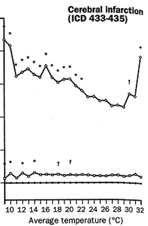 Một nghiên cứu tại Đài Loan công bố những người già, nguy cơ mắc bệnh nhồi máu não ở 32 độC cao hơn 66% so với mức 27-29C. Vào mùa hè, khi nhiệt độ tăng cao, cơ thể chúng ta dễ mất nước do đổ mồ hôi để điều hòa thân nhiệt. Quá trình này làm tăng chất dịch nhày trong máu, đồng thời các mạch máu có khuynh hướng trở nên lồi lõm làm gia tăng sự hình thành của các cục máu đông. Khả năng điều nhiệt kém hay nói đúng hơn là khả năng thích ứng của cơ thể theo tuổi tác làm cho nhóm người cao tuổi rơi vào tình trạng báo động đỏ về nguy cơ đột quỵ do cục máu đông.