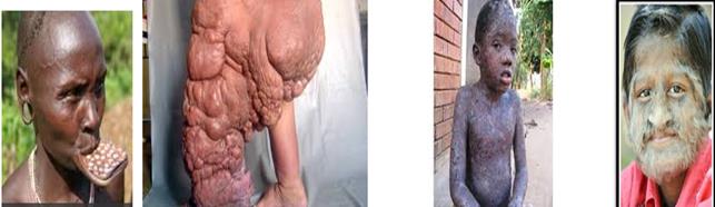 -Hội chứng mặt sư tử (Lion face syndrome): Sự phát triển mất kiểm soát của xương sọ - mặt khiến cho mặt bệnh nhân trông giống như mặt sư tử. Rối loại kèm theo hay gặp là mất thị lực (do thần kinh thị giác bị xương chèn ép).