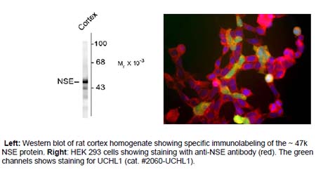 4.McAleese SM, Dunbar B, Fothergill JE et al. (1989). "Complete amino acid sequence of the neurone-specific gamma isozyme of enolase (NSE) from human brain and comparison with the non-neuronal alpha form (NNE)". Eur. J. Biochem. 178 (2): 413–7. doi:10.1111/j.1432-1033.1988.tb14465.x. PMID 3208766.