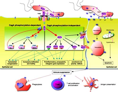 Một số vi khuẩn H. pylori sử dụng một phần phụ giống như kim để đưa độc tố sinh ra bởi một gen gọi là gen liên quan gây độc tế bào (cytotoxin-associated gene A_cagA) vào trong đoan nối nơi mà các tế bào lớp lót dạ dày gặp nhau. Độc tố này (hay CagA) làm thay đổi cấu trúc tế bào dạ dày và cho phép vi khuẩn dính vào chúng dễ dàng hơn. Nếu sự phơi nhiễm với độc tố càng lâu thì càng gây ra viêm mạn tính. Tuy nhiên, không phải tất cả chủng H. pylori là mang gen cagA và chính những chủng có gọi là cagA-positive. Các bằng chứng về dịch tễ học cho thấy rằng nhiễm trùng chủng cagA-positive có liên quian đặc biệt với một sự tăng nguy cơ ung thư dạ dàu vùng không phải tâm vị và giảm nguy cơ ung thư dạ dày tâm vị và ung thư tuyến thực quản. Chẳng hạn, một phân tích tổng hợp 16 nghiên cứu bệnh chứng tiến hành trên khắp thế giới cho thấy các cá nhân nhiễm phải chủng cagA-positive H. pylori có nguy cơ cao gấp hai lần ung thư dạ dày vùng không tâm vị so với cá nhân nhiễm khuẩn cagA-negative H. pylori. Ngược lại, một nghiên cứu bệnh chứng tiến hành ở Thụy Điển tìm thấy người bị nhiễm cagA-positive H. pylori giảm nguy cơ ung thư tuyến thực quản có ý nghĩa thống kê. Tương tự, một nghiên cứu bệnh chứng khác tiến hành tại Mỹ tìm thấy rằng nhiễm trùng cagA-positive H. pylori có liên quan với giảm nguy cơ ung thư tuyến thực quản và ung thư dạ dày tâm vị, nhưng các nhiễm trùng đó với các chủng cagA-negative không có liên quan nguy cơ. Các nghiên cứu gần đây coh thấy cơ chế tiềm tàng thông qua CagA có thể góp phần vào sinh ung thư dạ dày trong ba nghiên cứu, nhiễm trùng CagA-positive H. pylori có liên quan đến sự bất hoạt các protein ức chế khối u (tumor suppressor protein), gồm cả p53.