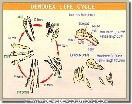 Chu kỳ sống của Demodex có 5 giai đoạn: trứng, ấu trùng, tiền nhộng, nhộng và con trưởng thành. Theo ghi nhận trong y văn, mất khoảng thời gian 3 - 4 ngày từ giai đoạn trứng đến tiền nhộng và khoảng 7 ngày từ nhộng phát triển thành con trưởng thành. Demodex thường sống thành đôi, vòng đời trong khoảng thời gian 18 - 24 ngày trên vật chủ của nó. Con cái đẻ 20 - 24 trứng trong nang tóc. D. folliculorum cái ngắn hơn và tròn hơn con đực. Cả hai đều có bộ phận sinh dục ngoài, sau khi giao phối, chúng đi sâu vào bên trong da và đẻ trứng ở nang lông hoặc tuyến bã, mang theo vi khuẩn và bài tiết ra chất thải, chết ở trong da ngay sau khi đẻ trứng. Sau khi chết, xác của chúng hóa lỏng và phân hủy trong da và gây ra phản ứng dị ứng ở một số bộ phận mô da, đốm đỏ. Viêm dị ứng da tại chỗ, ban đỏ, sẩn và mụn mủ là phản ứng bởi hệ thống miễn dịch và phản ứng viêm tại chỗ.