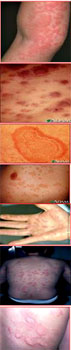 Các ban đỏ sạm màu bao gồm một số vệt nhạt màu ở mông, xungquanh là vùng da đỏ. Ban đỏ có thể rất ngứa và suy nhược cơ thể. Các tổn thương có xu hướng mất đi khoảng 24 giờ sau đó và di chuyển khắp cơ thể.