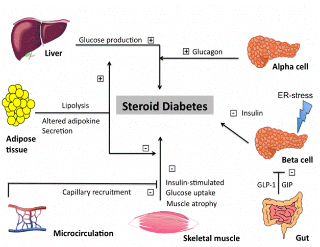 Glucocorticoid được sử dụng trong điều trị viêm khớp, hen phế quản, dị ứng. Dù được sử dụng theo đường uống hay tiêm truyền tĩnh mạch, tiêm tại khớp thì thuốc này đều có thể làm tăng đường huyết. Nguyên nhân do glucocorticoid không những làm tăng tổng hợp glucose mà còn làm tăng đề kháng insulin.