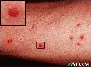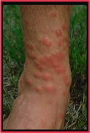 Phản ứng này đầu tiên chỉ biểu hiện là các chậm màu đỏ hơi ngứa trên vùng da tiếp xúc. Trong vòng vài giờ, các chấm đỏ này trở nên bọng nước và ngứa tăng nhanh hơn. Mỗi nốt sẩn tương ứng với vị trí xâm nhập của từng ấu trùng đi vào.