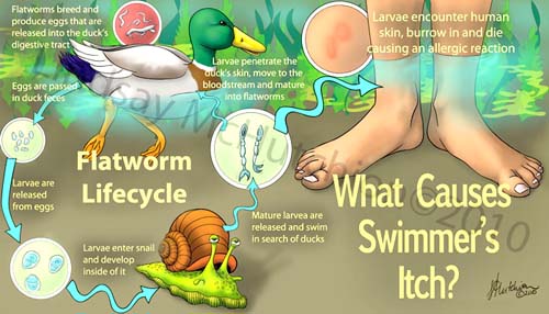 Một số ký sinh trùng sán lá khác họ Schistosomatidae cũng là những tác nhân gây nên bệnh lý Swimmer’s itch. Các ký sinh trùng này sử dụng cả ốc nước ngọt và vật chủ là động vật có xương sống trong chu kỳ sinh học và phát triển của chúng. Hầu hết bầy chim bơi dưới nước là các động vật vật chủ có xương sống. Trong suốt một giai đoạn đời sống của chúng, ấu trùng cercaria, rời khỏi ốc nước ngọt và bơi tự do trong vũng nước ngọt, cố gắng hay bắt gặp với các loài chim bói cá hoặc chim bơi dưới nước. Các ấu trùng này có thể tiếp xúc tình cờ với da của người bơi lội. Ấu trùng cercaria đi xuyên da và chết trong da ngay sau đó. Các ấu trùng cercaria không thể nhiễm vào con người, nhưng chúng có thể gây phản ứng miễn dịch viêm (inflammatory immune reaction).