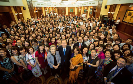 | Tổng Thư ký Ban Ki Moon cùng phu nhân chụp ảnh lưu niệm với nhân viên của UN đang làm việc tại Việt Nam |