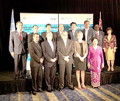 Thượng nghị sĩ Bob Carr-Bộ trưởng bộ Ngoại giao Úc và ngài Ray Chambers-Đặc phái viên của Tổng Thư Ký Liên Hiệp Quốc chụp ảnh lưu niệm cùng lãnh đạo các nước tại Hội nghị Sốt rét 2012. |