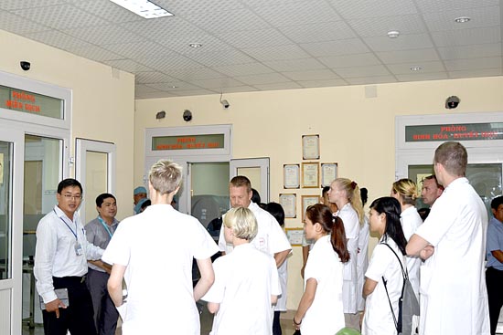 Dưới sự hướng dẫn của TS.BS. Huỳnh Hồng Quang-Phó Viện trưởng cùng các cán bộ của Phòng Hợp tác quốc tế, các sinh viên Thụy Điển lần lượt đến thăm các labo xử lý mẫu, labo miễn dịch, labo sinh hóa-huyết học và trực tiếp xem các kỹ thuật viên vận hành các phương tiện hiện đại nhất của khu vực miền Trung & Tây Nguyên. Tiếp đó, đoàn cũng được hướng dẫn thăm và tìm hiểu các hoạt động, kết quả khám chữa bệnh tại Phòng khám chuyên khoa của Viện. Các sinh viên Thụy Điển tỏ ra rất hào hứng và đặt rất nhiều câu hỏi cho các cán bộ chuyên môn tại phòng khám.