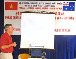 Đại tá-PGS.TS. Nguyễn Xuân Thành-Viện trưởng Viện Vệ sinh phòng dịch Quân đội báo cáo tại Hội nghị | TS. John Aaskov-Chuyên gia Trường Đại học tổng hợp Kỹ thuật Queensland-Australia báo cáo tại Hội nghị |