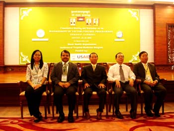 Từ trái sang phải: Ms. Cecilia T. Hugo (ACTmalaria, Philippines); TS. Raman Velayudhan (WHO-Philippines); TS. Duong Socheat (Giám đốc TT phòng chống sốt rét quốc gia Cambodia; TS. Chang Moh Seng (WHO-Cambodia); TS. Chea Nguon (Phó giám đốc TT phòng chống sốt rét Quốc gia Cambodia) |