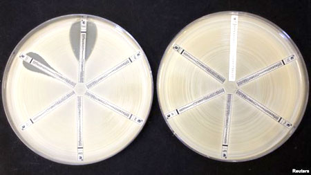 | Hai đĩa đã được phủ một vi khuẩn đề kháng với thuốc kháng sinh gọi là Klebsiella với một đột biến được gọi là NDM 1 và sau đó phơi nhiễm với các kháng sinh khác nhau được nhìn thấy tại Cơ quan bảo vệ sức khỏe ở phía bắc London, ngày 9/3/2011 |
