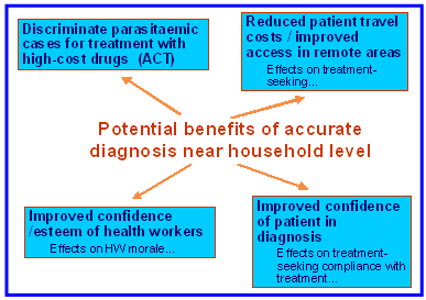 Trung bình, chi phí của một liệu trình thuốc ACTs là cao hơn chi phí của test RDTs. Chi phí trung bình của ACTs tính chung cho các nhóm tuổi xấp xỉ khoảng 0.75 USD, trong kih chi phí trung bình cho một test chẩn đoán nhanh khoảng chừng 0.5 USD. Vì phần lớn các nguyên nhân gây sốt nếu là âm tính với sốt rét, thì toàn bộ chi phí thử nghiệm các ca sốt rét nghi ngờ và điều trị chỉ khi nó dương tính có thể thấp hơn chi phí điều trị cho những ca sốt rét nghi ngờ rất nhiều tại nhiều nơi. Tuy nhiên, lợi điểm của việc xác định xác định chẩn đoán sốt rét là không chỉ liên quan đến sự tiết kiệm kinh tế, mà còn cung cấp cho những nhân viên y tế các công cụ cho phép họ nhận ra phần lớn bệnh nhânbị sốt nhưng không nhất thiết phải là sốt rét.