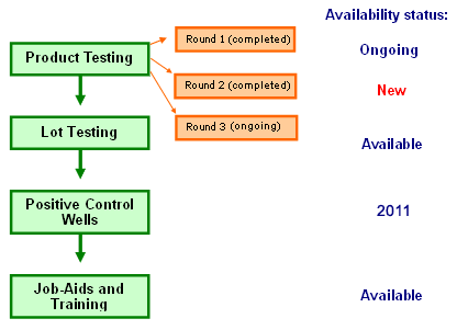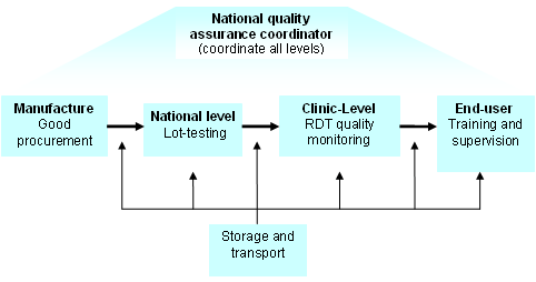 WHO đã cùng với các đối tác tổ chức khác đánh giá thực hiện của các RDTs mà các nhà sản xuất đã đệ trình xin đăng ký thương phẩm và các vấn đề hàng năm báo cáo liên quan đến RDTs có đưa ra. WHO cũng cung cấp một dịch vụ qua đócác quốc gia có thể gởi một mẫu của test RDTs họ mua để đảm bảo chất lượngcho các trung tâm vùng, để mục đích lô xét nghiệm RDTs này được kiểm tra chất lượng nhiều mặt trước khi chúng đem đi sử dụng.