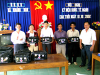 Bàn giao ban túi y tế cho cán bộ y tế xã và y tế thôn bản 2 xã Khánh Nam và Khánh Trung: TS. Nguyễn Đình Tân và Ông Nguyễn Tình PCT UBND xã Khánh Nam trao túiy tế cho y tế thôn bản.