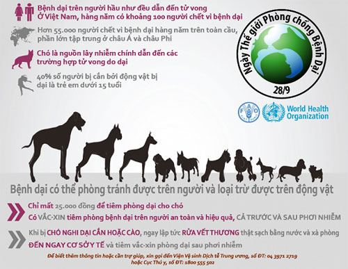 Theo Tổ chức Y tế thế giới (WHO), ngày 28 tháng 9 hàng năm là Ngày phòng chống bệnh dại thế giới (World Rabies Day_WRD_WRD) nhằm nâng cao nhận thức cộng đồng về tác hại của bệnh dại đối với người và động vật và tuyên truyền cách phòng chống bằng cách ngăn chặn bệnh dại ở động vậ theo chủ đề WRD năm 2015: “Hãy cùng nhau kết thúc bệnh dại bằng cách tiêm phòng cho chó” (Let’s end rabies together by vaccinating dogs).