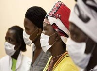 Bệnh nhân bị bệnh lao (TB) và HIV mang khẩu trang trong khi chờ đợi tư vấn tại bệnh viện ở thị trấn Khayelitsha của Cape Town, Nam Phi. |