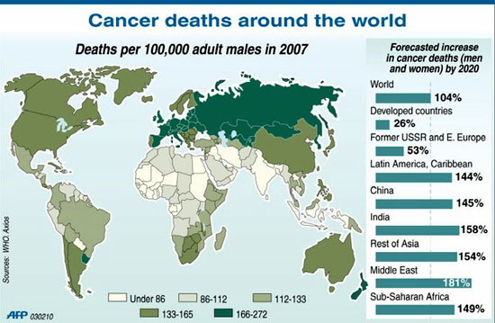 Theo WHO, mỗi năm có 12,7 triệu người được chẩn đoán mắc bệnh ung thư và 7,6 triệu người chết vì căn bệnh này. Trong một so sánh tổng thể, cứ 4 người chết thì có 1 chết vì bệnh có bướu. Nam giới thường mắc bệnh ung thư phổi và phế quản và ung thư tuyến tiền liệt, còn ở nữ giới ung thư vú là nguyên nhân gây tử vong nhiều nhất, tiếp theo là ung thư phổi và phế quản ngày càng gia tăng. Các chuyên gia ước tính đến năm 2030, mỗi năm có khoảng 26 triệu người được chẩn đoán mắc bệnh ung thư trên toàn thế giới và 17 triệu người sẽ chết vì nó. Những việc phòng ngừa đúng cách và sống lành mạnh có thể giảm một phần ba những trường hợp mắc bệnh, một phần ba nữa có thể giảm qua việc thường xuyên kiểm tra sức khỏe và xét nghiệm sàng lọc sớm. Vào Ngày ung thư thế giới năm 2010, người đoạt giải Nobel về y học Harald zur Hausen khởi xướng việc nâng cao ý thức của người dân toàn cầu và đề nghị cha mẹ và ông bà trên thế giới nên nêu gương sống lành mạnh cho trẻ em và các cháu sẽ góp phần đáng kể vào việc mà bạn và con bạn được khỏe mạnh. Ai sống phóng túng, nguy hiểm, không những chỉ gây hại cho sức khỏe của chính mình mà còn cả con trẻ của mình, sự thay đổi lối sống lâu dài là có thể ngăn chặn khoảng một nửa trong số tất cả các bệnh ung thư.