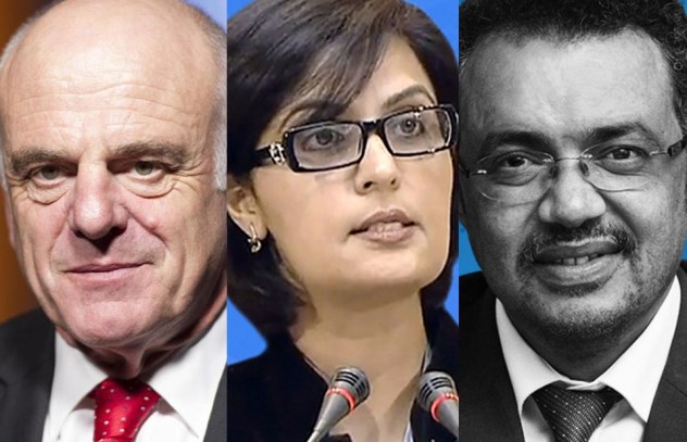 3 ứng viên Tổng Giám đốc WHO (2017-2022) từ trái qua phải TS. David Nabarro của UK,TS. Sania Nishtar của Pakistan vàTS. Tedros Adhanom Ghebreyesus của Ethiopia.