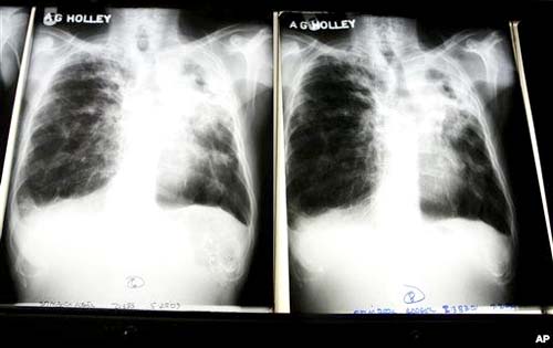 Hình ảnh X quang của một bệnh nhân bị lao phổi ở Bệnh viên A.G Holley, Lantana, Florida tháng 12 năm 2009 |
