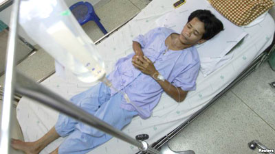 | San Petchrod, 47 tuổi, nằm trên giường, nơi ông đang được điều trị sốt rét tại bệnh viện Sai Yoke, tỉnh Kanchanaburi, Thái Lan, ngày 26/10/2012 |
