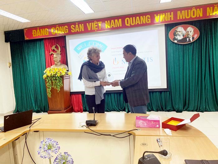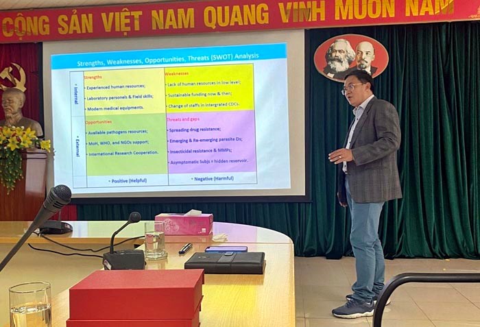 Tại buổi làm việc, TS.BS. Huỳnh Hồng Quang, Phó Viện trưởng, thay mặt Lãnh đạo Viện giới thiệu về Viện và tình hình các bệnh ký sinh trùng tại Việt Nam, đặc biệt là bệnh sán lá gan lớn (Fascioliasis) trong 5 năm gần đây. Từ năm 2018-2022, số ca mắc bệnh sán lá gan lớn ở người duy trì ổn định, thậm chí có dấu hiệu tăng dưới sự biến đổi khí hậu toàn cầu. Đáng chú ý, tổng số ca mắc trong giai đoạn này cao hơn gấp hai lần so với tổng số ca ghi nhận trong 10 năm trước đó (2008-2017), cho thấy mức độ lưu hành bệnh vẫn đáng báo động.