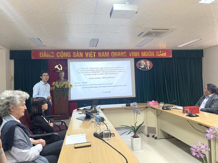 TS.BS. Nguyễn Hoàng Châu, Trưởng nhóm nghiên cứu ký sinh trùng, Đơn vị Nghiên cứu Lâm sàng Đại học Oxford (OUCRU) tại Việt Nam, trình bày tổng quan về Nghiên cứu CEGAB2404 cũng như tiến độ thu tuyển bệnh nhân.