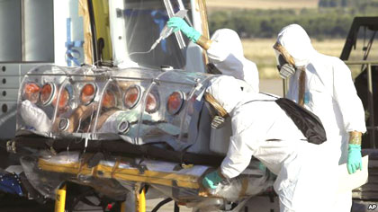 | Bức ảnhcủa Bộ Quốc phòng Tây Ban Nha:các nhân viên cứu trợ và các bác sĩ hỗ trợ Miguel Pajares, một linh mục người Tây Ban Nha đã bị nhiễm virus Ebola trong khi làm việc tại Liberia |