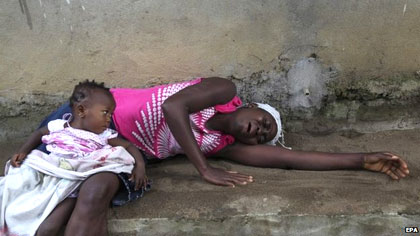 | Một người phụ nữ Liberia khóc than về cái chết của một người thân do Ebola ở ngoại ô Monrovia |
