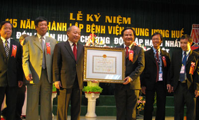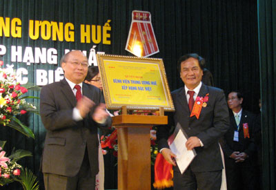 Bộ trường Bộ Y tế Nguyễn Quốc Triêụ trao Huân chương Lao động hạng Nhất và giấy chứng nhận Bệnh viện hạng đặc biệt cho Bệnh viện Trung ương Huế (Ảnh NetCoDo) |