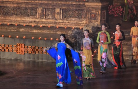 Festival Huế 2012 không chỉ quyến rũ du khách bởi quy mô tổ chức hoành tráng chuyên nghiệp mà còn ở yếu tố lại hóa, và mang đậm tính dân tộc, tôn vinh nhiều giá trị văn hóa các vùng miền, nhiều quốc gia khác nhau. Lễ hội Áo dài tiếp tục hướng đến hình tượng thanh tao của Việt Nam thông qua chủ đề” Hoa sen trong hội”. Một loài hoa đã trở thành Quốc hoa – biểu tượng cho dân tộc Việt Nam qua bàn tay khéo léo, niềm đam mê, sự nổ lực sáng tạo của 17 nhà thiết kế đã mang đến đêm hội hơn 300 mẫu Áo dài đầy ấn tượng, độc đáo, mới lạ. Âm thanh, ánh sáng sân khấu được thiết kế ngay (Bia Quốc học) bên bờ sông Hương thơ mộng, không gian tô điểm thêm vẻ đẹp của những tà áo dài tung bay thướt tha.