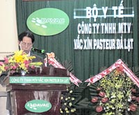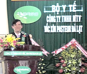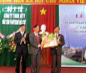 Đến dự với Lễ kỷ niệm, PGS.TS Nguyễn Thanh Long -Thứ trưởng Bộ Y tế thay mặt cho Lãnh đạo Bộ Y tế đã chúc mừng 76 năm thành lập Pasteur Đà Lạt và 5 năm thành lập Công ty; đồng thời đánh giá rất cao về sự đóng góp Công ty trong công tác sản xuất Vắc xin, đặc biệt là Vắc xin thương hàn phục vụ cho công tác phòng bệnh; các chế phẩm và thực phẩm chức năng hỗ trợ cho sức khỏe con người. Thứ trưởng Bộ Y tế mong muốn Công ty phát huy thành tích đã đạt được, tiếp tục thực hiện nhiệm vụ chính trị mà Bộ Y tế giao cho trong công tác nghiên cứu Vắc xin dự phòng một số bệnh và vươn tới xuất khẩu ra nước ngoài. Lãnh đạo Ủy ban nhân dân tỉnh Lâm Đồng cũng đã phát biểu chúc mừng và mong muốn Công ty ngày càng phát triển và thực hiện tốt nhiệm vụ chính trị của Bộ Y tế giao cho. Trong buổi Lễ kỷ niệm nhiều tập thể và cá nhân của Công ty cũng vinh dự được nhận Bằng khen của Bộ Y tế trao tặng. |  |