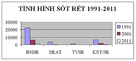Số BNSR | 22.227 | 6.263 | 1.300 | -71,82% (1991/2001) -94,15% (1991/2011) |