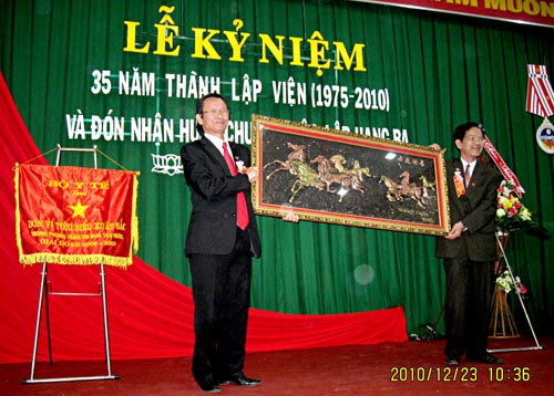 PGS.TS. Triệu Nguyên Trung-Viện trưởng Viện Sốt rét-Ký sinh trùng-Côn trùng Quy Nhơn tặng bức tranh " Mã đáo thành công" cho Viện Vệ sinh dịch tễ Tây Nguyên nhân Lễ kỷ niệm 35 năm thành lập (1975-2010) và đón nhận Huân chương Độc lập hạng Ba |