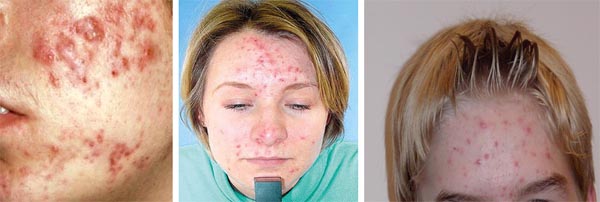 ·  !important; Mụn trứng cá do thuốc có chứa thành phần steroides: nếu đã và đang thoa các chế phẩm đã nêu trên kéo dài quá thì sẽ có còn có thể gây mặt đỏ sần sùi như vỏ cam sành, lông mọc dài ra, teo da, giãn mạch... Về điều trị, ngay lập tức phải ngừng các chế phẩm đang bôi lại. Tại chỗ bôi eryzel sáng, bôi Isotrex 0,05 % đúng vào mụn tối. Toàn thân uống 1 đợt Erythromycine 250 mg/1 viên x 2 viên x 2 lần/ ngày 5-10 ngày hoặc Doxycyline 100 mg/viên x 2 lần/ ngày x 15-30 ngày.
