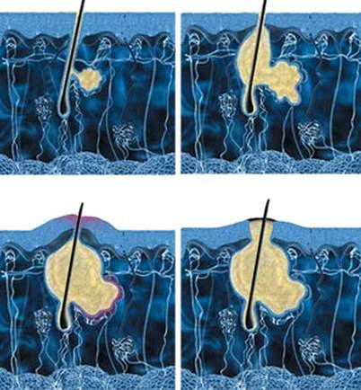 ·  !important; Chất bã bài tiết lên mặt da tạo nên một màng mỡ. Tại đây xảy ra phản ứng thủy phân axit béo thành triglycerit. Chất này thu hút vi khuẩn kỵ khí ở phần dưới cổ tuyến bã nang lông. Khi vi khuẩn gây viêm làm hình thành các mụn mủ, các ổ áp-xe làm phá hủy nang tuyến gây sẹo.