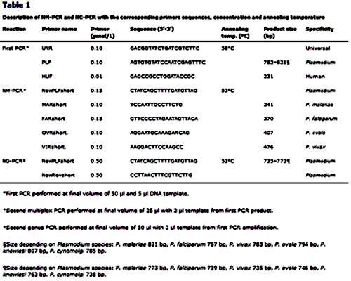 Một mẫu DNA đã được gửi đến phòng thí nghiệm nghiên cứu về bệnh SR và KST mới nổi (MAPELAB, CNM - ISCIII, Madrid, Tây Ban Nha) như một phần của một cuộc trao đổi không chính thức để kiểm soát độ chính xác của kết quả. Các mẫu được phân tích bằng kỹ thuật PCR lồng đa mồi đã điều chỉnh (the nested multiplex malaria PCR: NM-PCR) cũng dựa trên tiểu đơn vị nhỏ (SSU) gen rRNA, thêm PCR lồng (nested PCR) song song đối với khuyết đại Plasmodium (NG -PCR). Phương pháp NM -PCR có thể xác định cả bốn loài sốt rét ở người (P. vivax , P. falciparum, P. ovale và P. malariae) trong hai khuyếch đại ghép liên tiếp, trong khi NG -PCR xác định tất cả loài Plasmodium. Trình tự mồi, nồng độ và chu kỳ luân nhiệt để thiết lập các phương pháp