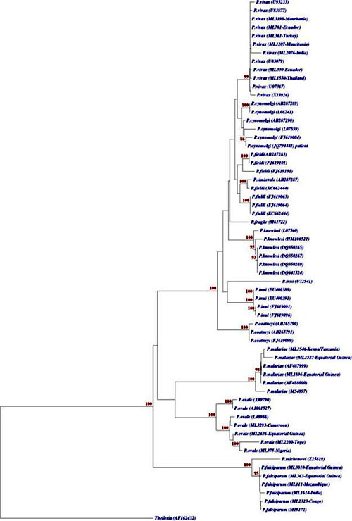 Ngoài ra, cây phả hệ phát sinh loài đã được thực hiện, với phần mềm Treecon, sau khi ClustalW sắp hàng trình tự bằng phương pháp Neighbour joining method, so sánh trình tự kiểu A SSU rRNA thu được từ bệnh nhân với 60 trình tự từ mười hai loài Plasmodium. Cây phát sinh loài cho thấy trình tự của ký sinh trùng ở bệnh nhân hình thành một nhánh có cùng nguồn gốc với P. cynomolgi và độc lập với nhánh trình tự của P. vivax, thêm một bằng chứng cho thấy bệnh nhân đã bị nhiễm P. cynomolgi (xem hình).