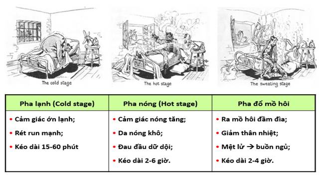 Sốt  | Sốt hàng ngày, sôt cách nhật, sốt nhẹ hoặc không sốt; có thể khởi đầu sốt liên tục; mô tả khó và thời gian có thể kéo dài, thậm chí đến 24-36 giờ  | Sốt cách nhật, ngắt quãng, thay đỗi và thời gian ngắn khoảng 8 giờ  |