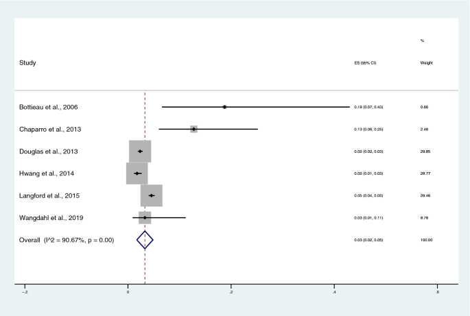 Số lượng BNSR ác tính doP. malariae và tổng số bệnh nhân nhiễm sốt rétP. malariae được sử dụng để ước tính tỷ lệ hiện mắc gộp của sốt rétP. malariaeác tính(tệp bổ sung 2). Kết quả ước tính tổng hợp cho thấy tỷ lệ hiện mắc sốt rétP. malariaeác tính là 3% (KTC95%: 2-5%), với mức độ không đồng nhất cao (I²: 90,67%, P< 0,001), được tính toán bằng phân tích hiệu ứng ngẫu nhiên (Hình 2). Tỷ lệ nhiễm SRAT doP. malaria cao nhất được ghi nhận trong nghiên cứu của Bottieau (19%, KTC 95%: 7-43%) [26].