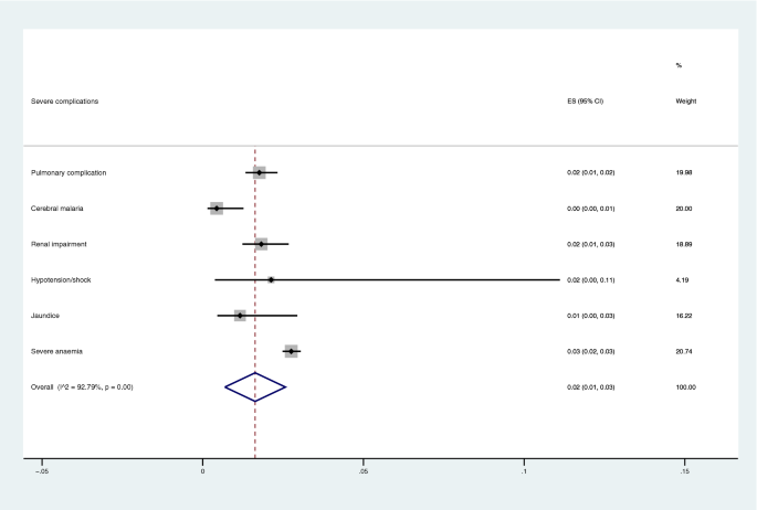 Chú giải:Severe complications (Biến chứng nghiêm trọng); Pulmonary complication (Biến chứng phổi); Cerebral malaria (Sốt rét ác tính thể não); Renal impairment (Suy thận); Hypotension/shock (Hạ huyết áp/sốc); Jaundice (Vàng da); Severe anaemia (Thiếu máu nặng); Overall (Tổng thể); ES (95% CI) : Ước lượng điểm (khoảng tin cậy 95%).