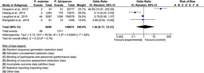 Số biến chứng nghiêm trọng ở BNSR nhiễm P. malariae và tổng số biến chứng nghiêm trọng ở bệnh nhân nhiễm tất cả các loài Plasmodium đã được sử dụng để ước tính tỷ lệ gộp các biến chứng nghiêm trọng trong nhiễm P. malariae so với các loài Plasmodium khác (tệp bổ sung 3). Tỷ lệ gộp biến chứng nghiêm trọng trong nhiễm P. malariae so với loài Plasmodium khác được trình bày trong Hình 3.