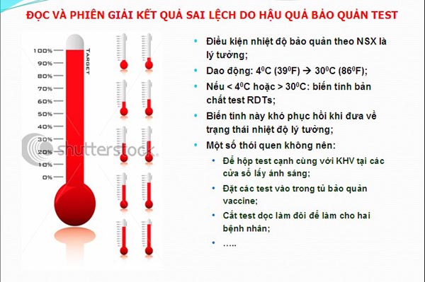 Một vấn đề nữa cũng rất đáng quan tâm khi sử dụng test RDTs khi dùng chúng để phát hiện hoặc chẩn đoán bệnh sốt rét. Trong điều kiện khu vực nóng ẩm và hanh khô của các tỉnh thành cùng với sự biến đỏi khí hậu toàn cầu như hiện nay, nhiệt độ thường các tháng 4-11 hàng năm có nơi lên đến trên 350C hoặc hơn, nên có thể làm khô dung dịch đệm mau chóng, dẫn đến còn que test nhưng hết dung dịch đệm.