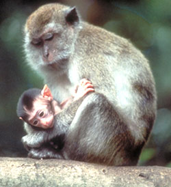 Các mẹ của khỉ đuôi dài macaque là những thành viên chăm sóc đầu tiên cho các con sơ sinh của chúng lúc mới sinh ra và rất có ý thức bảo vệ chúng, không cho phép chúng rời khỏi nắm bấu vào thân chúng khi đi ra ngoài (Wheatley và cs., 1999). Trong suốt tuần đầu tiên của cuộc sống, các con mẹ khỉ macaque duy trì tiếp xúc với con của chúng thường xuyên, nhưng khi tuổi các con đủ lớn thì sự tiếp xúc và chăm sóc giảm dần (Meishvili và cs., 1991). Vào thời điểm 4 tháng tuổi, mẹ bỏ ra ít thời gian để tiếp xúc với con của chúng và bắt đầu chu kỳ sinh trứng bình thường trở lại. Vào thời điểm con được 10 - 11 tháng tuổi thì mẹ đột ngột, hoặc dừng đột ngột việc chăm sóc nếu chúng cứ bám lấy đòi chăm sóc (Meishvili và cs., 1991).