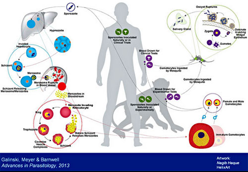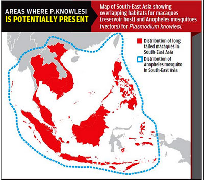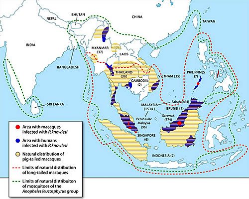 Ký sinh trùng Plasmodium knowlesi gây bệnh sốt rét trên khỉ M. fascicularis cũng có thể gây nhiễm sốt rét trên người. một số trường hợp đã được báo cáo trên người, thậm chí gây sốt rét ác tính và tử vong, song vẫn còn nhiều khía cạnh liên quan đến loài ký sinh trùng này vẫn chưa hiểu thấu đáo. Do đó, không thể đánh giá hết nếu xảy ra một mối đe dọa mới liên quan đến sức khỏe hoặc nếu chỉ mới khám phá nhờ vào các công cụvà kỹ thuật phát hiện sốt rét được cải thiện gần đây. Với lịch sử lâu dài của loài người và khỉ macaques sống cùng với nhau tại khu vực Đông Nam Á, điều đó có thể dẫn đến nhiều vấn đề cần nghiên cứu bổ sung thêm.