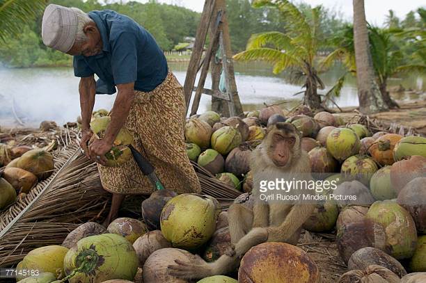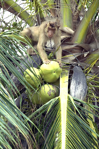 Mặc dù hiện nay không còn đe dọa, song các khỉ đuôi dài Macaca spp. là các con vật dễ bị ngược đãi và bức hại ở những nơi mà đang có vụ mùa và chúng tiếp xúc với con người như tấn công lấy thức ăn. Chúng được coi là động vật gây hại nghiêm trọng cho nông nghiệp, chúng đi vào các vườn và ăn trái cây, gồm cam, chuối, dừa cũng như các mùa thu hoạch khoai sọ, khoai tây, lúa gạo, sắn và khoai mì. Mối tương tác này có thể vì thời điểm nông nghiệp con người bắt đầu và khỉ đuôi dài macaques đến. Nhằm đối phó với khỉ, con người thường bắn khỉ và có thể loại bỏ toàn bộ quần thể khỉ tại chỗ (Wheatley và cs., 1999).