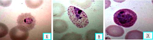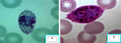 Các giao bào trưởng thành hình tròn, chiếm đầy 2/3 thể tích hồng cầu. Hồng cầu hơi lớn và có nhiều chấm nhỏ và chứa nhiều chấm hay hạt pigment, mà điều này có sự sắp xếp phân biệt ở giữa, hầu hết là ở ngoại vi.